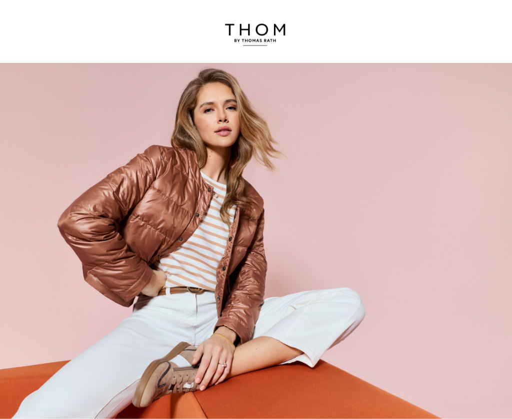 Zeitlos und frisch: Die neue F/S Womenswear-Kollektion von THOM bei Thomas Rath verbindet klassische Silhouetten mit frischen Farbakzenten. Creme- und Beigetöne treffen auf helles Braun sowie auf lebendige Nuancen in Rot und Pink, die jedem Look moderne Leichtigkeit verleihen. Bewährte Klassiker wie weit geschnittene Stoffhosen, elegante Blusen, sportliche Jacken im Bomber- oder Trenchcoat-Stil sowie Oberteile mit feinen Streifen lassen sich mühelos miteinander kombinieren und unterstreichen den mühelos eleganten Charakter der Kollektion.